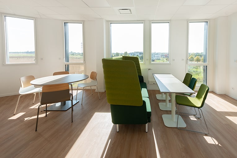 Comme l’explique Clotilde Champetier, cheffe d’agence immobilière pour GRDF dans la région Nord-Ouest, le projet d’Isneauville s’inscrit dans une démarche de rationalisation des implantations.. À l’origine, GRDF avait plusieurs sites répartis dans la métropole de Rouen. “Regrouper nos activités sur un seul site répondait à une volonté de créer des synergies entre les métiers et d’offrir un environnement qui favorise les interactions et le travail collaboratif”, explique-t-elle. Odile Condé, Directrice régionale d’Inovim Développement, complète : “c’était une façon pour l’entreprise de s’adapter aux nouvelles pratiques professionnelles telles que le télétravail et le nomadisme”. Cette configuration inédite permet une plus grande proximité entre les fonctions techniques, commerciales et administratives grâce à des espaces conçus pour stimuler la performance collective et renforcer la culture d’entreprise.